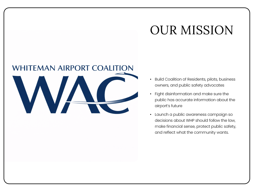 The Whiteman Airport Coalition brings together community leaders, public safety professionals, aviation stakeholders, local businesses, and residents who care about what happens at Whiteman Airport.
